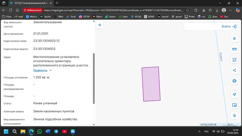 Площадь участка - 1250 квадратных метров. Фасад - 25 метров. Категория земель - земли населённых пунктов. Вид разрешённого использования - личное подсобное хозяйство (то же, что ИЖС).