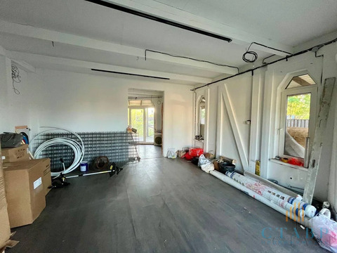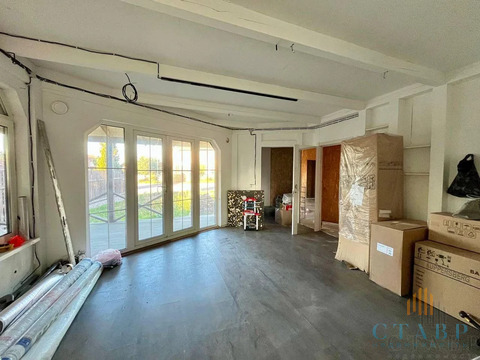 На первом этаже кухня, гостиная с выходом на террасу, с/у и 1 спальня.