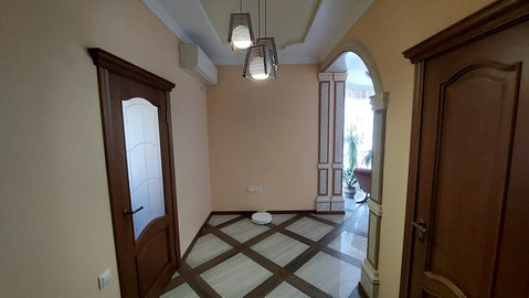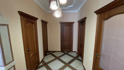 Планировка. Прихожая, коридор, гостиная, кухня-столовая, три изолированные спальни, гардеробная, котельная-кладовка, ванная комната, туалет. Дверь из кухни ведёт на террасу.