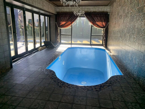- бассейн в отдельном помещении с панорамным остеклением, что позволяет открывать помещение в летнее время для прямого доступа с улицы;