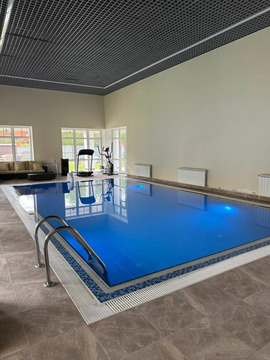 1-й этаж: большой холл-гостиная, кхня-столовая, кабинет, две спальни, зона отдыха с бассейном (сауна, душевая, раздевалка) два с/у, технические помещения, теплый гараж на 3 м/м;