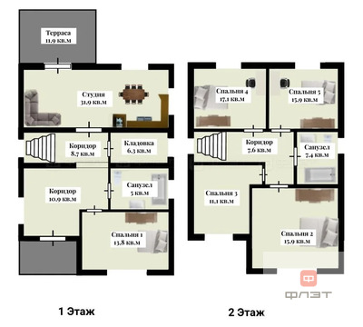Второй этаж: четыре уютные спальные комнаты, предоставляющие достаточно пространства для всей семьи, и еще один санузел.