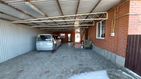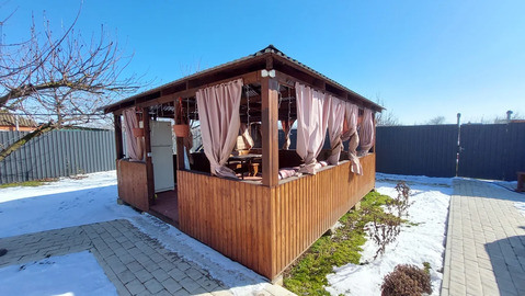 Двор укрыт навесом из профнастила на металлическом каркасе, выложен плиткой, места достаточно для четырёх автомобилей. В глубине двора капитальная летняя кухня, также меблированная, есть газовая плита, раковина. В задней части двора есть баня-бочка, каркаcный баcсeйн ёмкостью 25 м3, беседка с холодильником и мебелью, зона барбекю с мангалом и запасом дров. Кроме того, здесь же находится капитальный сарай с глубоким погребом. Имеется садовая техника и инвентарь.