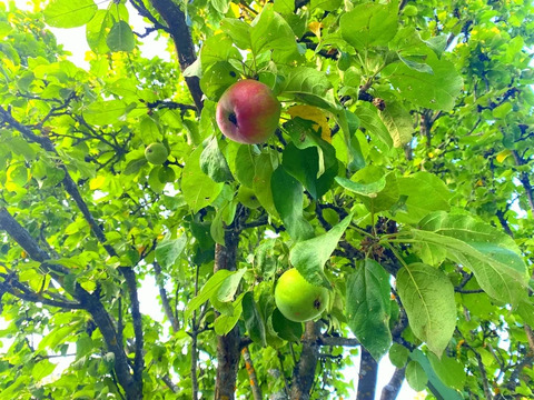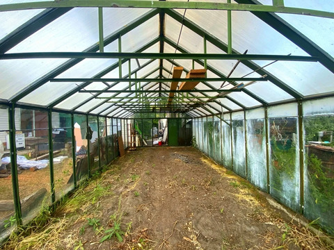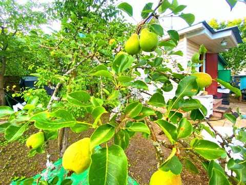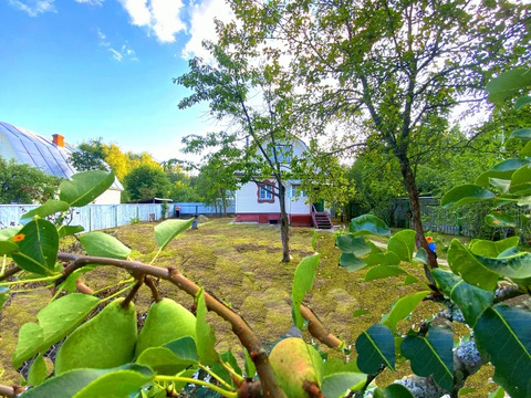 На ровном, ухоженном участке растут плодово-ягодные деревья и кустарники: чёрная и красная смородина, черешня, груши, яблони, вишня, цветы.