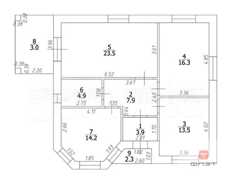 3 комнаты (16,3+13,5+14,2 кв.м) плюс кухня гостинная (23,5 кв.м) с выходом на террасу, санузел, холл, тамбур.