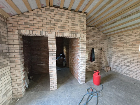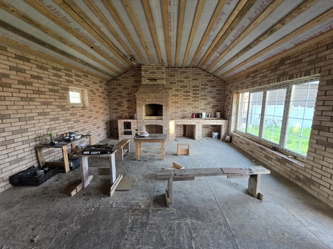 Отдельным зданием построен банный комплекс, готовность 80%, состоящий из парилки, душевой, с/у и удобной и большой барбекю-зоны. Выполнен из кирпича, с внешней и внутренней стороны обложен фасадным кирпичом, кровля – металлочерепица утепленная.