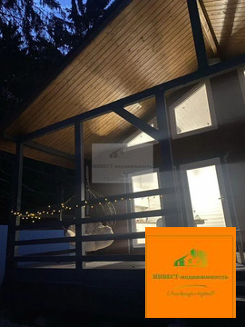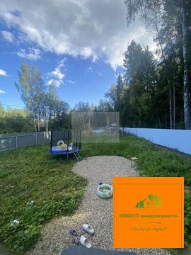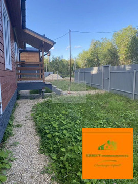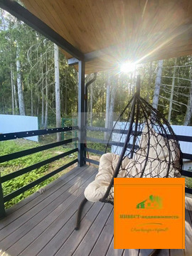 На террасе вас будет ждать подвесная качель — отличное место для отдыха и релаксации. Вокруг дома выложена отмостка, а на участке — дорожки. На участке растут ёлочки, а сам он огорожен забором.