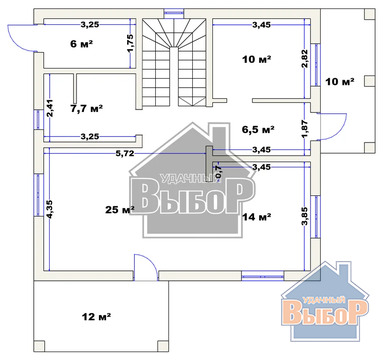 На 1 этаже расположены прихожая с навесом 6.5 кв. м., большая кухня-гостинная с выходом на веранду 14+25 кв. м., комната 10 кв. м., смежный санузел 7.7 кв. м., бойлерная 6 кв. м. с отдельным входом с улицы.